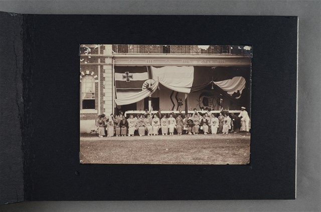 玻璃底片用蛋清作原料所洗出的相片一冊,內有安平港晚渡、安平英國領事館、鳳山城外水牛及車、臺南藝伎、臺南開山神社、鄭成功像、臺南守備騎兵隊、臺灣榕樹、臺南竹仔街等27張相片。