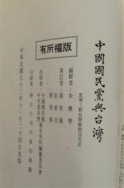1.本書為《中國國民黨與台灣》,於民國53年由中國國民黨中央委員會黨史史料編纂委員會發行。