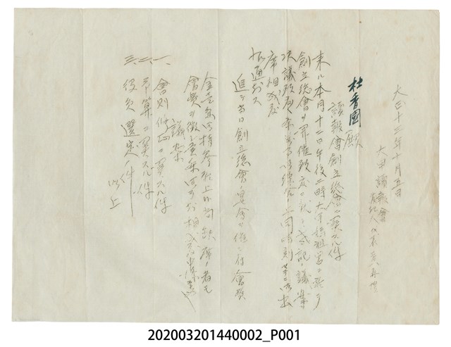大甲讀報會致杜香國參加創立總會以及附上討論議案信封