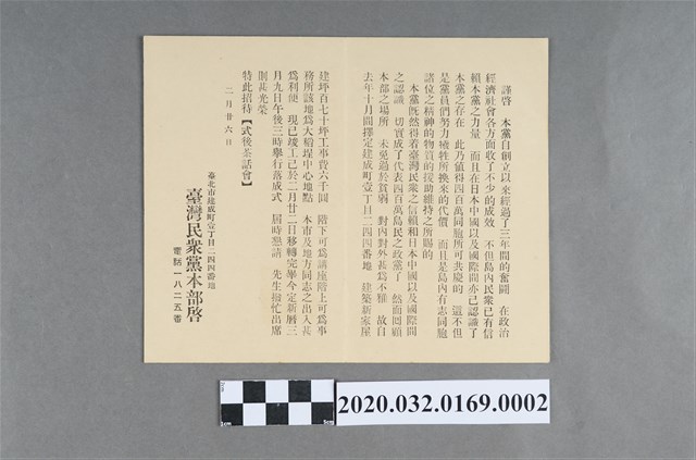 2020.032.0169.0002 杜香國臺灣民眾黨本部落成式通知