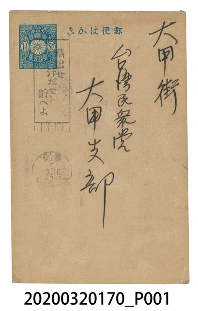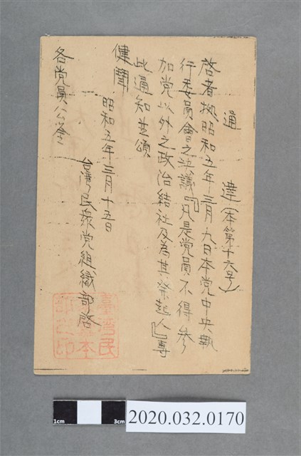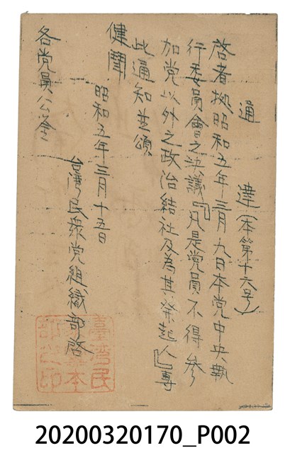 2020.032.0170 本部第16號通達書黨員不得跨黨明信片