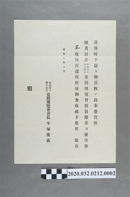 2020.032.0212.0002 台灣博覽會會長平塚廣義致大甲帽蓆同業組合長杜清