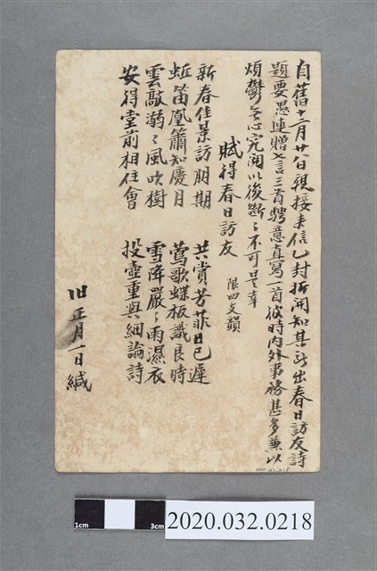 郭治玉寄臺灣總督府國語學校杜香國七言詩〈賦得春日訪友〉