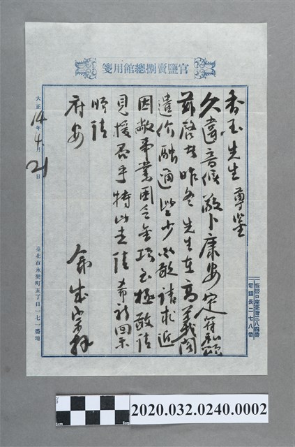 2020.032.0240.0002 永樂町官鹽賣捌總舘信封、專用信箋寄大稻埕大和行林成宗