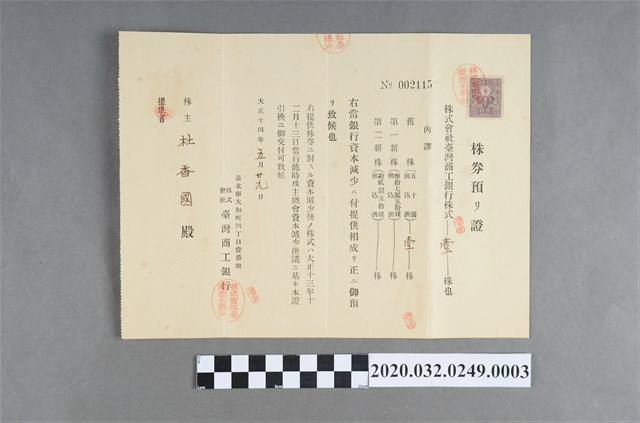 2020.032.0249.0003 臺灣商工銀行寄杜香國減資換股證