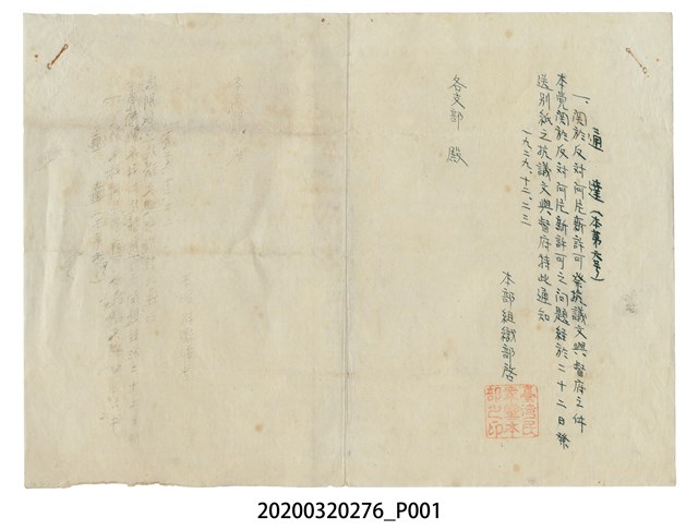 民眾黨組織部通達書本第6號反對鴉片抗議文與督府之件