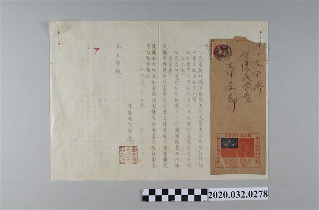 2020.032.0278.0001 民眾黨本第14號通達書關於阿片問題打破御用新聞惡宣傳之件,用歐文或和文打電報給住宿鐵道旅館國際聯盟鴉片調查委員信封