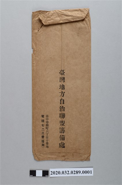 2020.032.0289.0001 臺灣地方自治聯盟發起人磋商會協議事項信封
