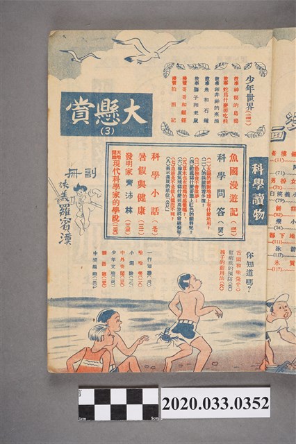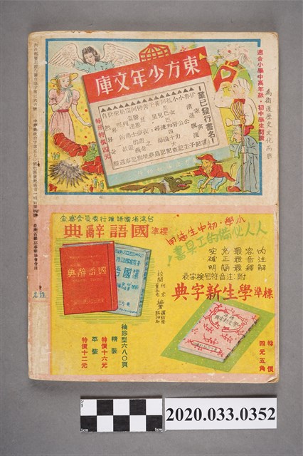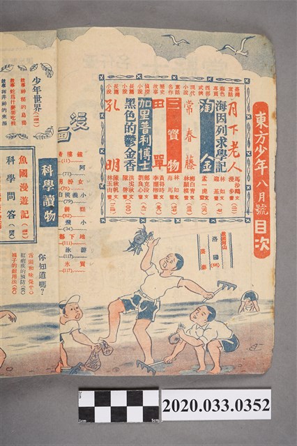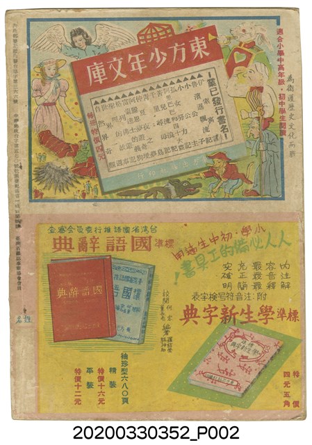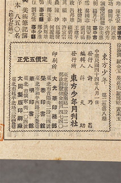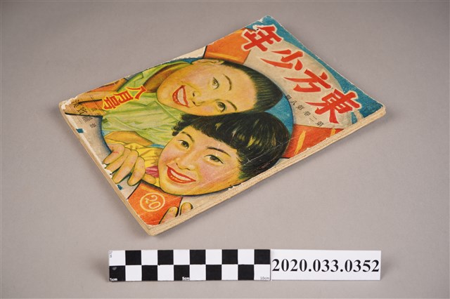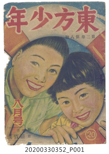 本案為是民國四十四年八月一日東方少年月刊社出版的《東方少年》八月號20刊物,為第二卷第八期,封面為兩個孩童,封底為辭典廣告。東方出版社,於1945年由游彌堅、林呈祿、范壽康等人創立。《東方少年》創刊於1954年,1961年停刊,先後由薛天助及廖大貴等人擔任主編。因該刊作者多受日本教育,且內容多改自日文圖書,因此承襲了許多日治時期兒童雜誌的特性。連載內容因為標明作者,因此難以判斷是否為本土作者之作品,然仍可辨識部分作品來自於日本漫畫家手塚治蟲、永島慎二等人的創作及美國漫畫《湯姆與傑利》。