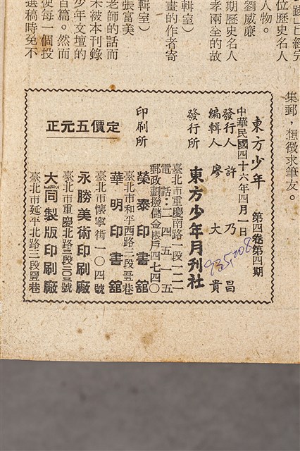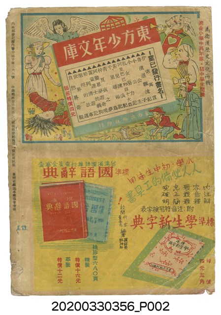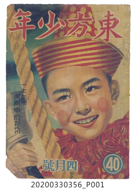 第40集,封面是小孩打扮成小丑的模樣,書背有東方出版社文庫書、字典的廣告,並於左下方有姓名欄位。東方出版社,於1945年由游彌堅、林呈祿、范壽康等人創立。《東方少年》創刊於1954年,1961年停刊,先後由薛天助及廖大貴等人擔任主編。因該刊作者多受日本教育,且內容多改自日文圖書,因此承襲了許多日治時期兒童雜誌的特性。連載內容因為標明作者,因此難以判斷是否為本土作者之作品,然仍可辨識部分作品來自於日本漫畫家手塚治蟲、永島慎二等人的創作及美國漫畫《湯姆與傑利》。