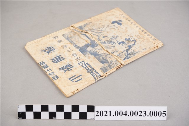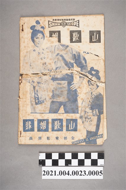 《山歌姻緣》歌本,中間被撕損,封面及封底印有電影劇照。曲目包括〈捕魚人兒世世窮〉、〈兩田西瓜不同籐〉、〈水深沒有你心深〉、〈蝶戀花〉...等。