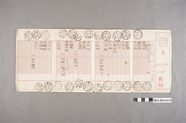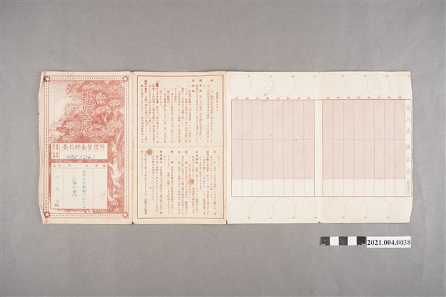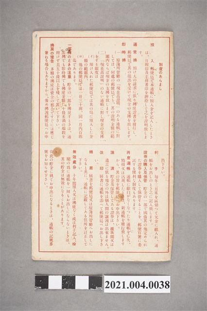 郭炎山開戶之郵局儲金簿,存摺管理單位為「臺北貯金管理所」,存摺帳號「台ろ81041」,登記住址為「臺南市末廣町二の一二、近藤商會內」,內頁有自昭和18年(1943)7月2日至昭和20年(1945)4月13日等25筆存款及提款蓋戳紀錄。