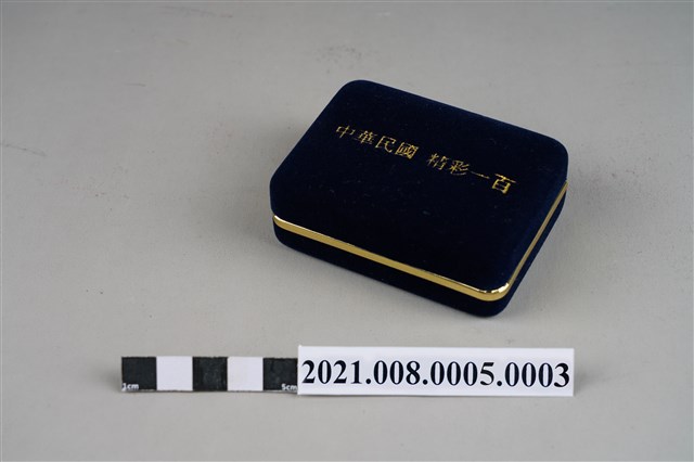中華民國建國百年紀念徽章,以金色壓紋亮面處理,外型為阿拉伯數字100中間鑲嵌中華民國國旗,此為外盒。由行政院推出「中華民國建國一百年識別標誌」設計。