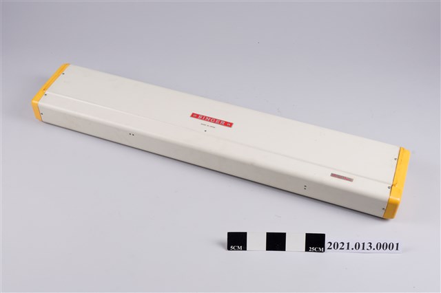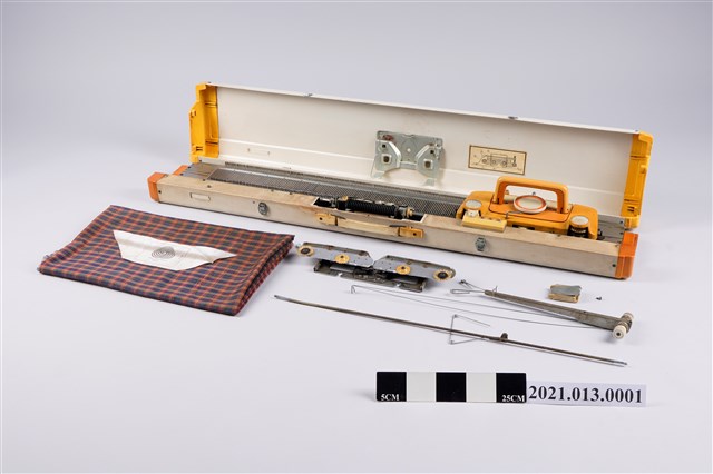 1.本物件為勝家Silver SK-323型編織機,主要材質為鐵及塑膠。主體結構及零件已有些許散落,因無說明書無法組合回去。物件上有SINGER、MADE IN JAPAN之牌子,正上方標示0-10的圓型轉盤為鬆緊刻度盤,刻度盤的周圍有ヒキアケ、ナしース、アミコミ之日文字樣;另外中間上方的計行器停留在1、4、9,一旁的區域則用透明膠帶封黏住。據捐贈者表示,本臺機器目前已無法使用。