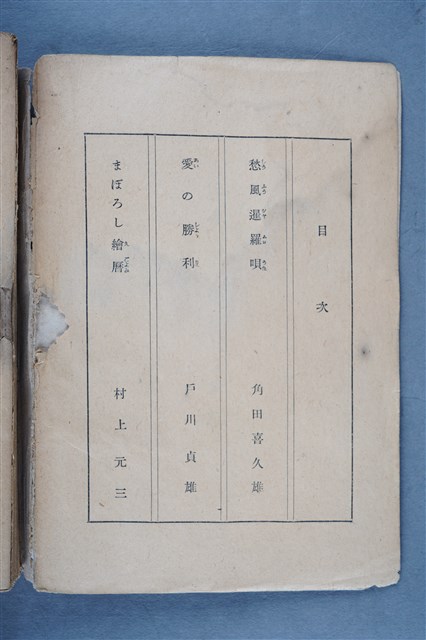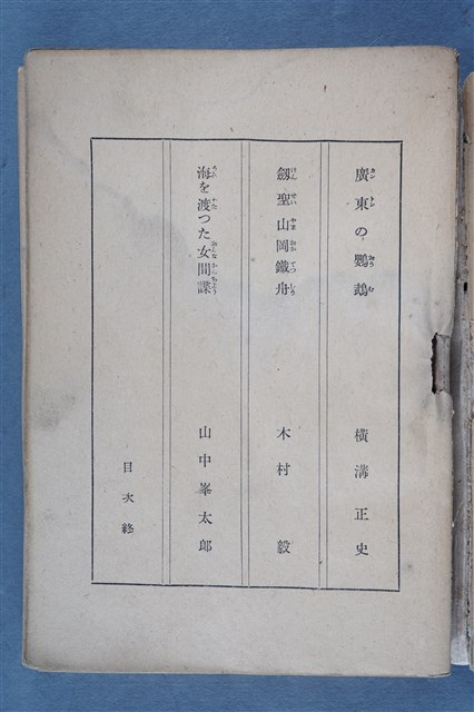 本件為久慈修太郎編著《愁風暹羅唄(外五篇)》,昭和17年(1942)5月20日發行,八紘社杉山書店發行,裝幀者為多田比島。內容收錄角田喜久雄的〈愁風暹羅唄〉、戶川貞雄的〈愛の勝利〉、村上元三的〈まぼろし絵曆〉、橫溝正史的〈廣東の鸚鵡〉、木村毅的〈釼聖山岡鐵舟〉、山中峯太郎的〈海を渡った女間諜〉等6位作家之小說作品。本文物為梁乃悅先生捐贈伯父梁梓義之日本時代個人物品。