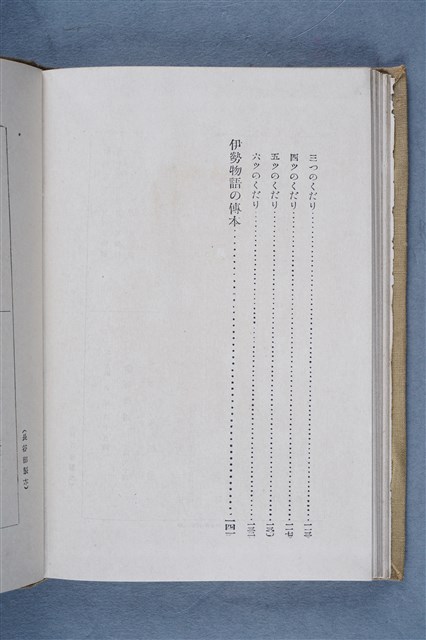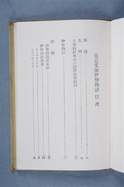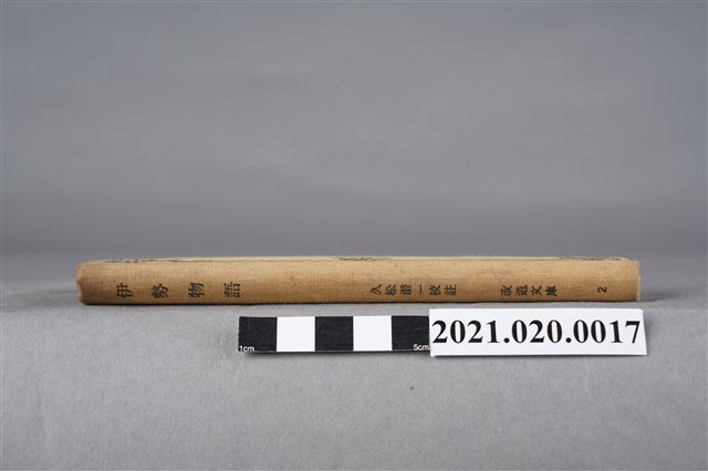 本件為日本國文學者久松潜一校註《伊勢物語》,昭和7年(1932)4月10日第30版,發行者為改造社。《伊勢物語》是以在原業平(825-880)為原型主角的故事作品,書中描述了其家族關係、戀愛關係、朋友關係、主從關係等內容。此作品是由不同的章話集合所構成,部分篇章具有脈絡關係,使得此部作品在日本文學史中出現若干版本,本書為日本國文學者久松潜一(1894-1976)根據藤原定家於1234年寫成之「天福本」校定而成。本文物為梁乃悅先生捐贈伯父梁梓義之日本時代個人物品。