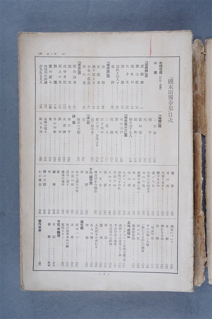 本件為改造社發行之《國木田獨步集》,昭和2年(1927)4月5日發行,為該社發行之「現代日本文學全集」中的第15集,收錄日本文學家國木田獨步(1871-1908)作品,包括:個人小傳以及《武藏野》(1898)、《獨步集》(1905、1908)、《運命論者》(1903)、《濤聲》(1907)、《渚》(1907)等作品選文以及個人詩篇、隨筆、日記、書信等文章。封底附有一張新竹市啟文書局的售價表。本文物為梁乃悅先生捐贈伯父梁梓義之日本時代個人物品。