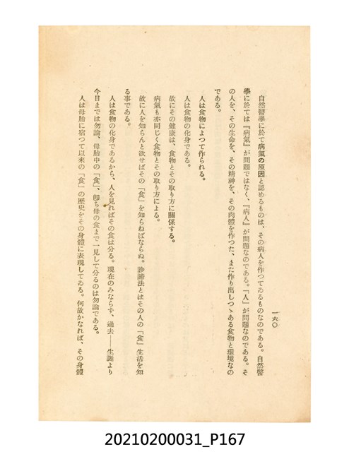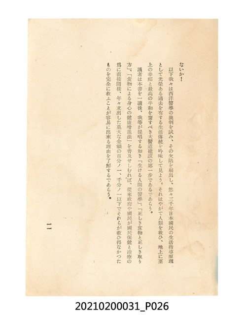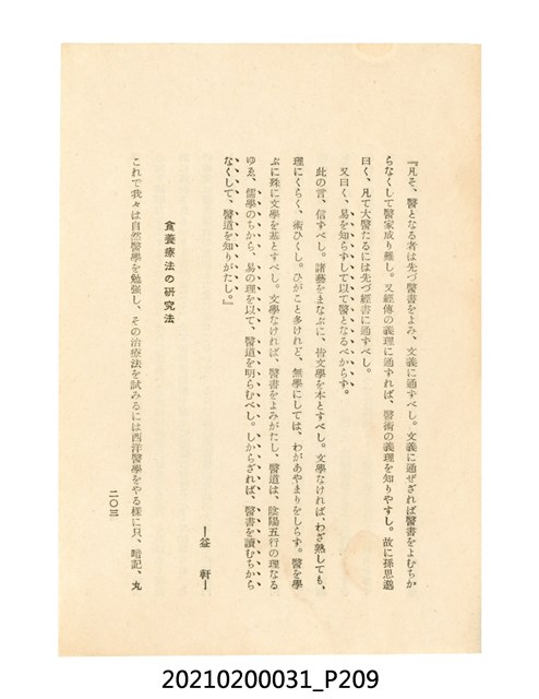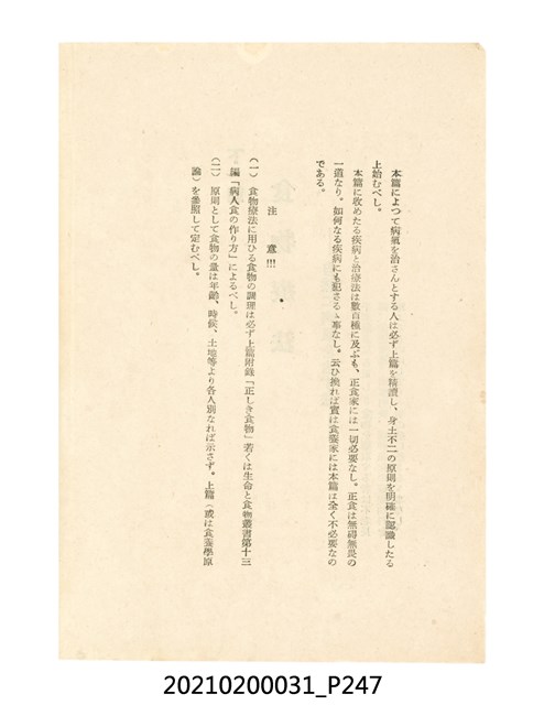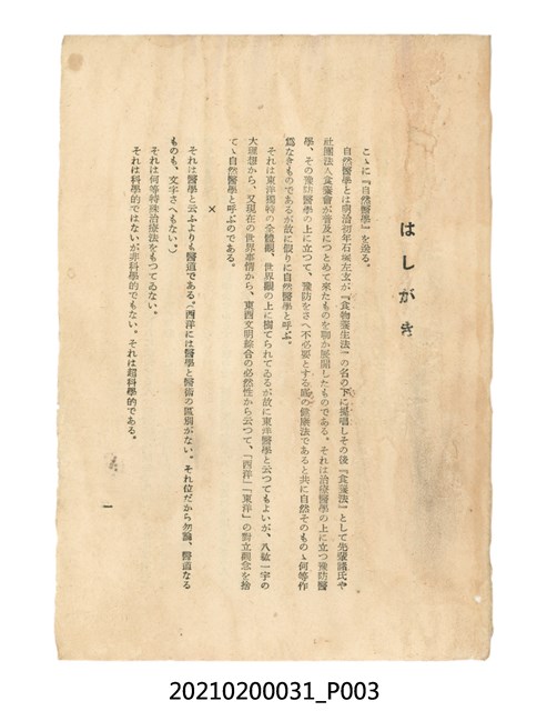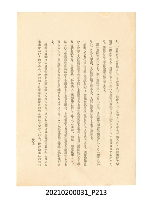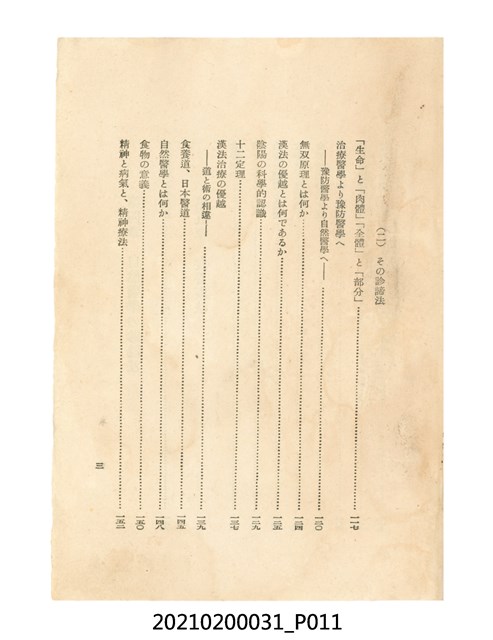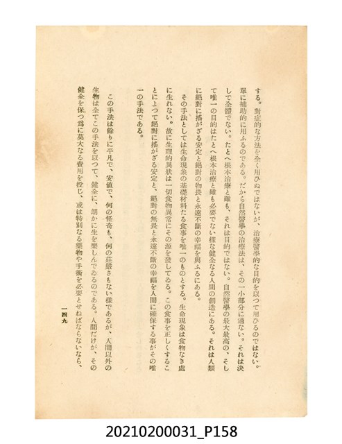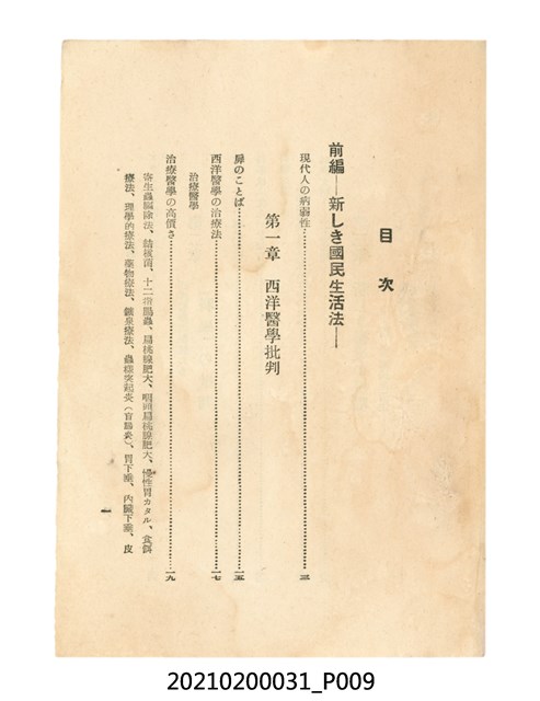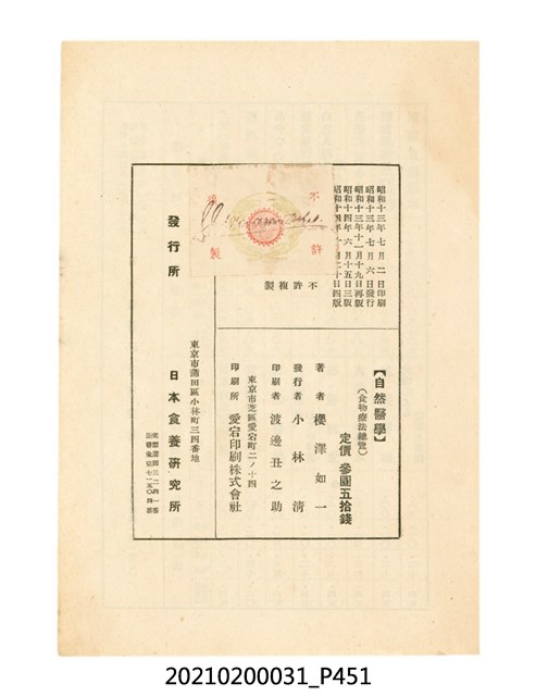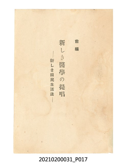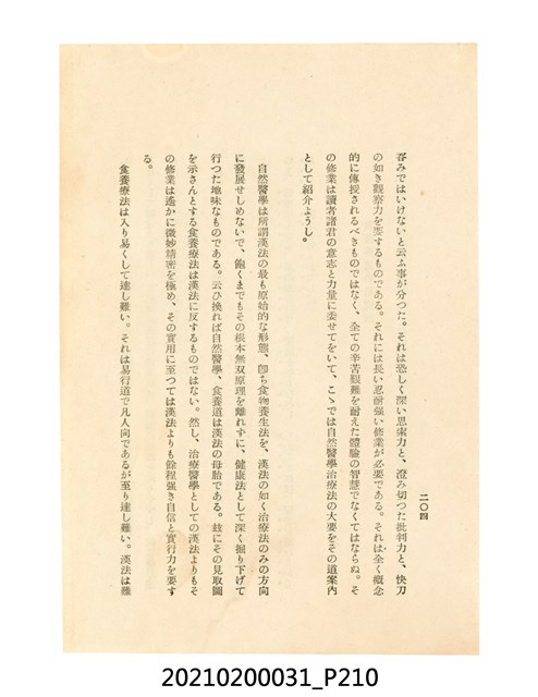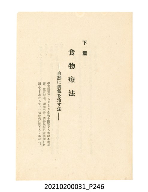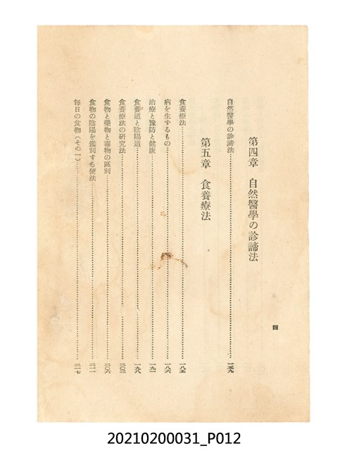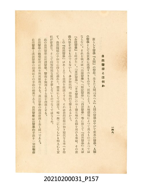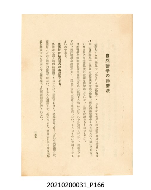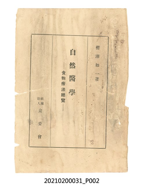 本件為櫻澤如一著《自然醫學》,副標題為:「日本食物療法總覽」,昭和14年(1939)10月20日4版,發行者為日本食養研究所,書籍共分五章,第一章為西洋醫學批判、第二章為「科學」的批判、第三章為新國民生活法的提倡、第四章為自然醫學的診斷法、第五章為食養療法、第六章為疾病的自然醫治法。書中內容主要為「自然醫學」的推廣。本文物為梁乃悅先生捐贈伯父梁梓義之日本時代個人物品。