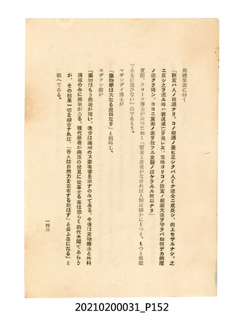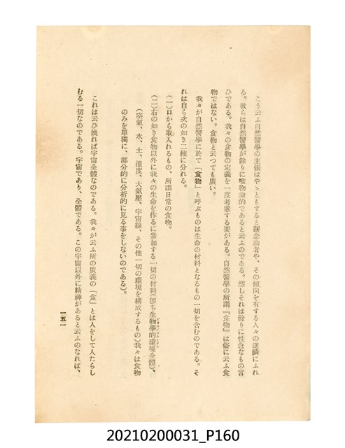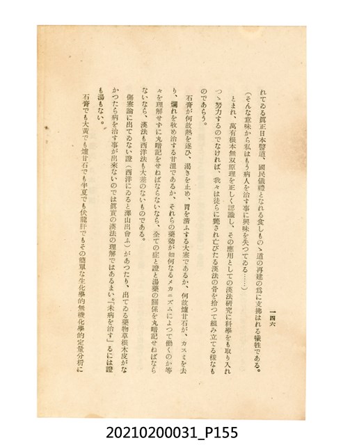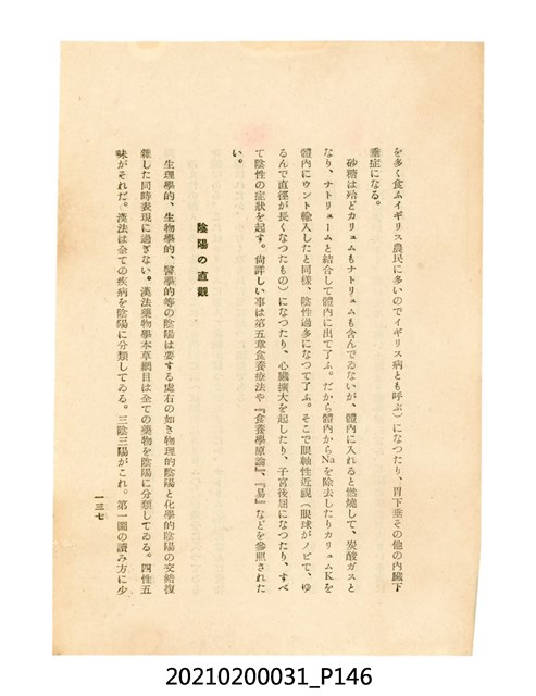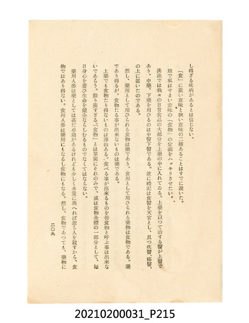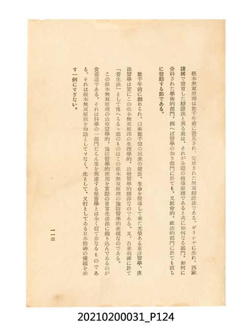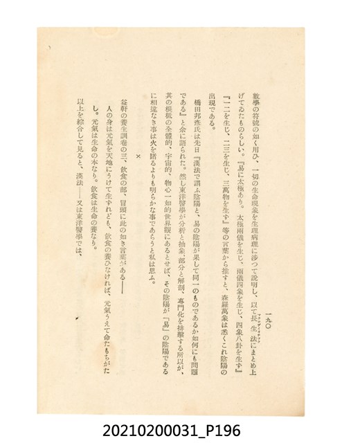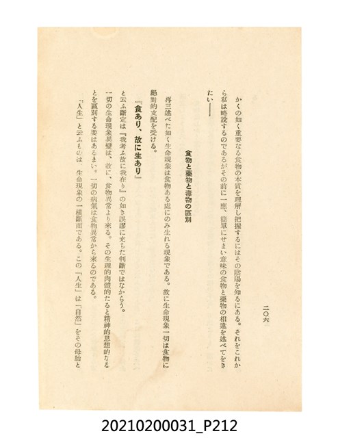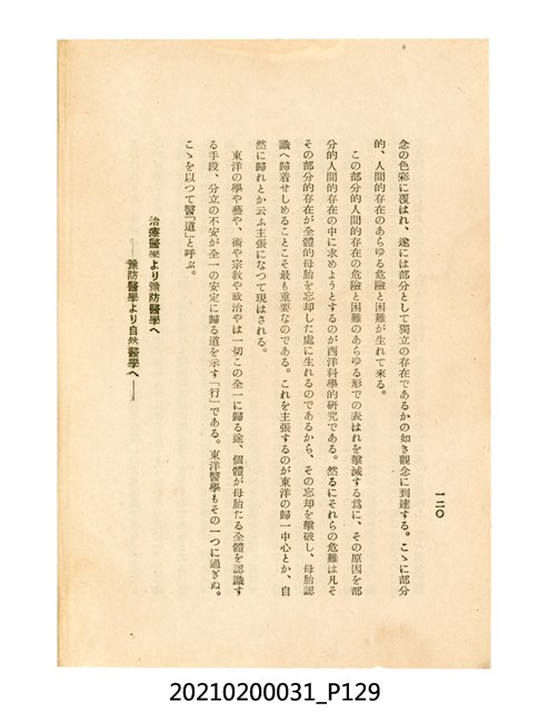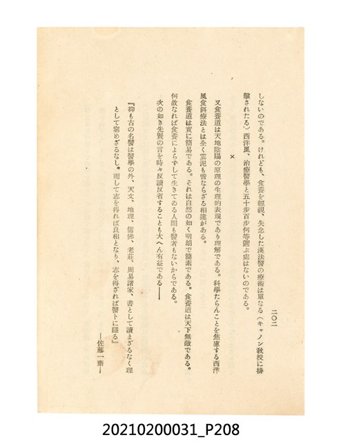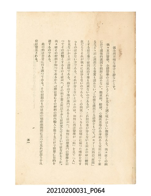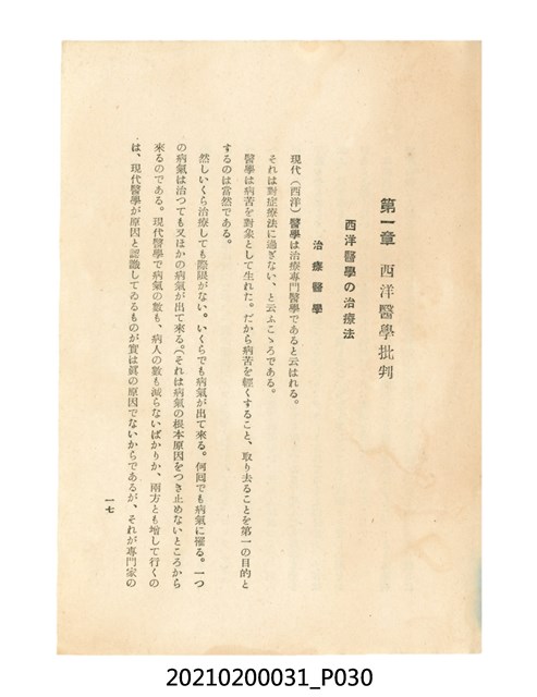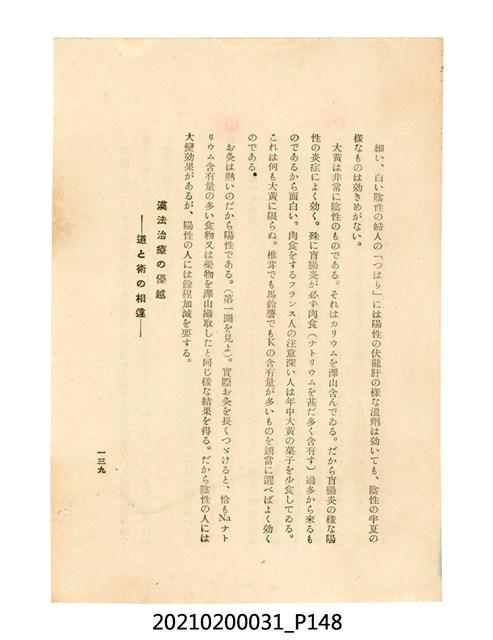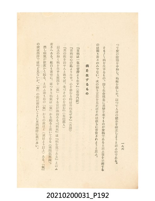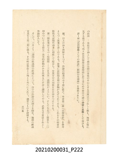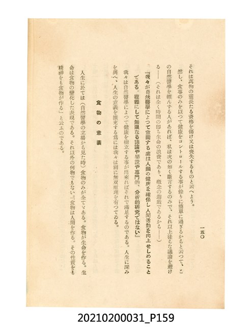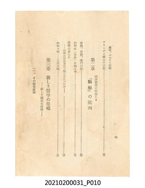 本件為櫻澤如一著《自然醫學》,副標題為:「日本食物療法總覽」,昭和14年(1939)10月20日4版,發行者為日本食養研究所,書籍共分五章,第一章為西洋醫學批判、第二章為「科學」的批判、第三章為新國民生活法的提倡、第四章為自然醫學的診斷法、第五章為食養療法、第六章為疾病的自然醫治法。書中內容主要為「自然醫學」的推廣。本文物為梁乃悅先生捐贈伯父梁梓義之日本時代個人物品。