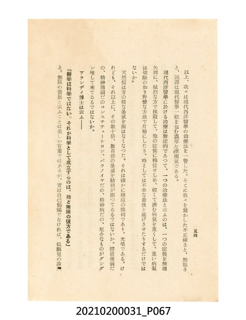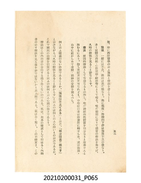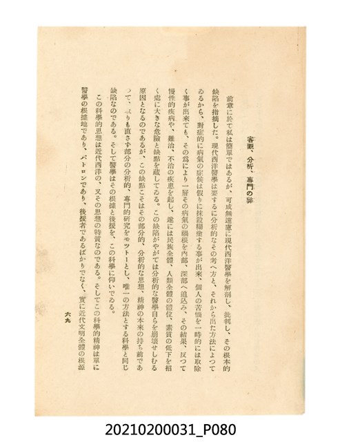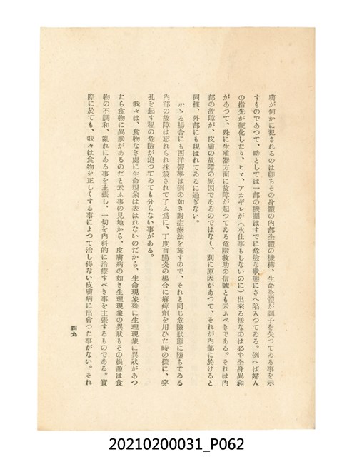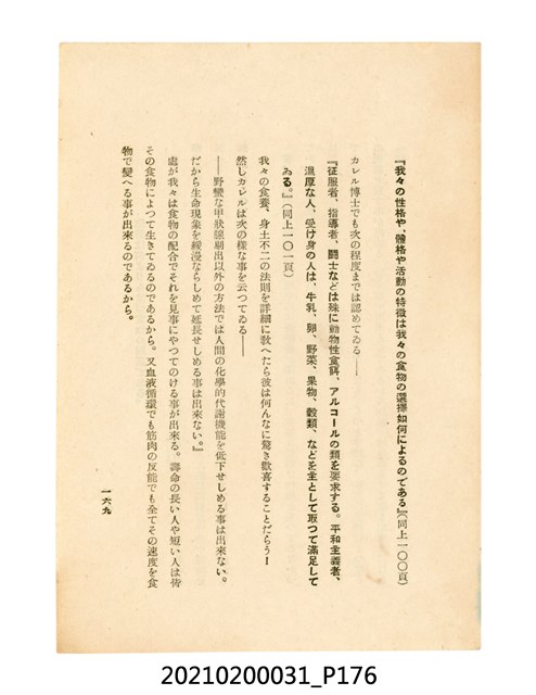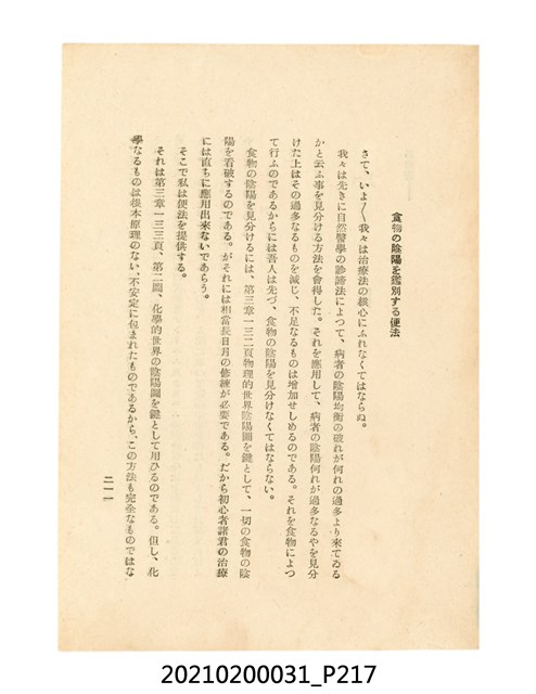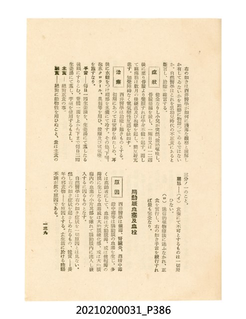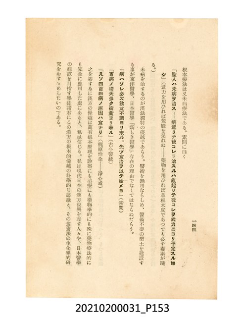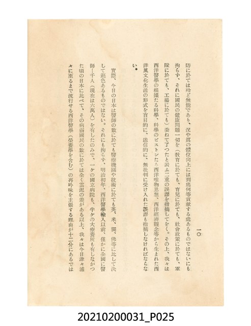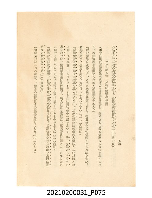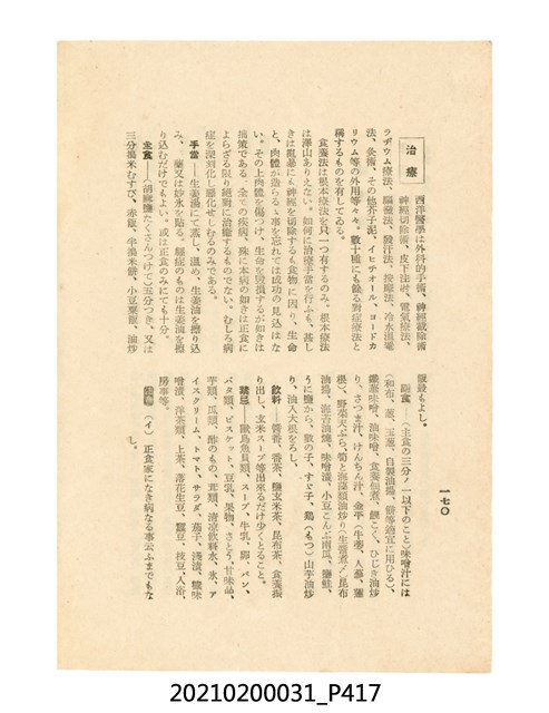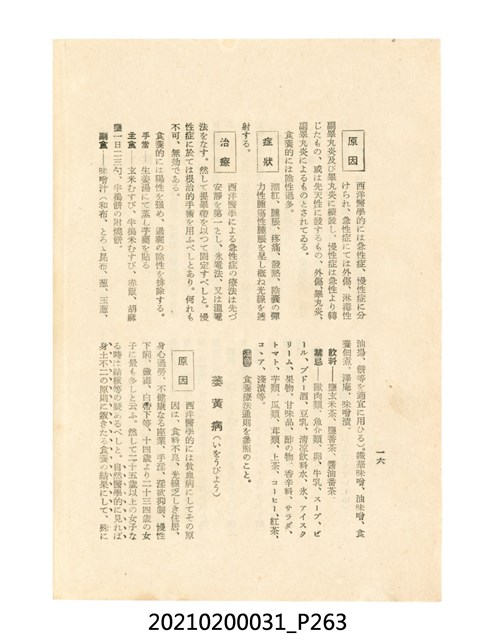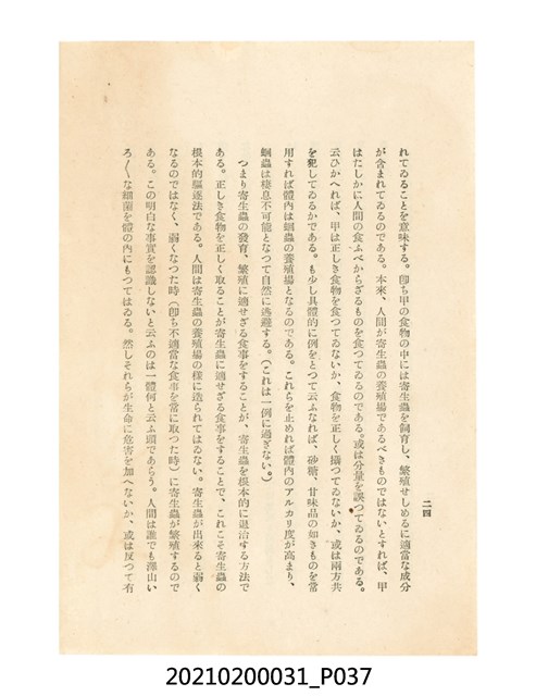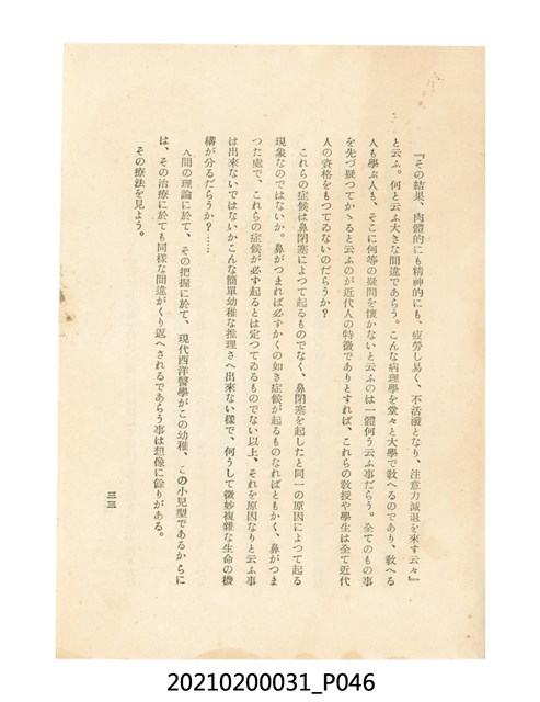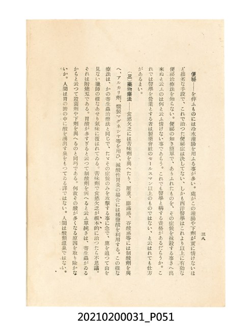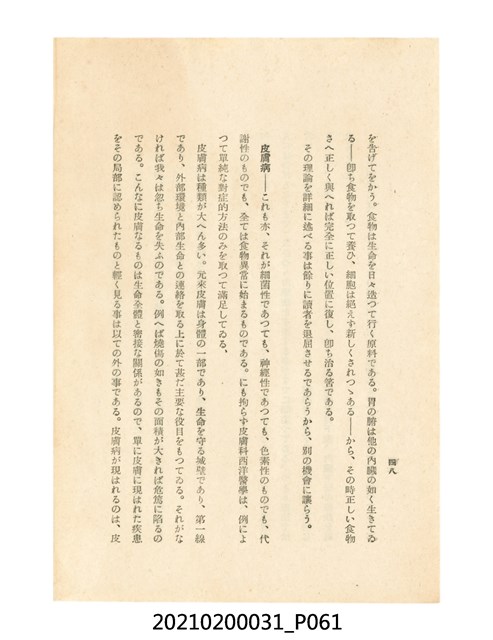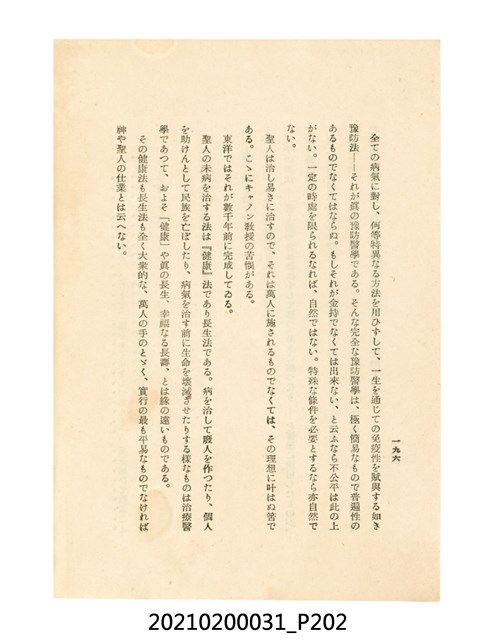 本件為櫻澤如一著《自然醫學》,副標題為:「日本食物療法總覽」,昭和14年(1939)10月20日4版,發行者為日本食養研究所,書籍共分五章,第一章為西洋醫學批判、第二章為「科學」的批判、第三章為新國民生活法的提倡、第四章為自然醫學的診斷法、第五章為食養療法、第六章為疾病的自然醫治法。書中內容主要為「自然醫學」的推廣。本文物為梁乃悅先生捐贈伯父梁梓義之日本時代個人物品。