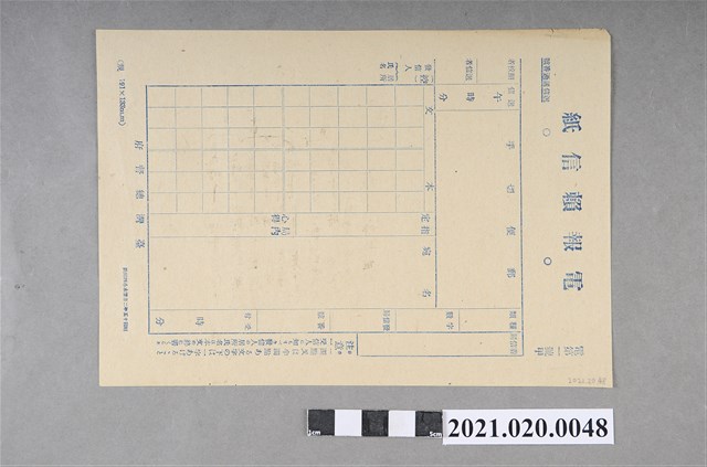 戰前學生讀書計畫表,持有人為梁梓義先生,夾藏於《早稻田中學講義》第58回第6號之「英語講義」(前編)內,正面為戰前空白電報信紙,背面寫有讀書時間計畫以及科目。本文物為梁乃悅先生捐贈伯父梁梓義之日本時代個人物品。