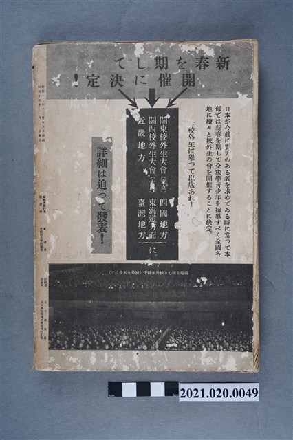 本件為早稻田大學出版部發行之《早稻田中學講義》,副標題為:「漢文講義」(前編),由早稻田大學教授松本洪講述,卷期為第58回第9號,發行日期為朝和13年(1938)12月1日,內容收錄學者、俳句詩人、政治家撰寫之範文,並提供語釋、通釋等參考資訊,書末附有販賣商桃園街日進商店書籤1個,寫有持有人梁梓義先生姓名。本文物為梁乃悅先生捐贈伯父梁梓義之日本時代個人物品。講義錄是戰前日本十分流行的通信教育(函授教育)教材,其中最有名的即早稻田大學發行的講義錄。早稻田大學的前身東京專門學校自1886年起開始發行通信講義