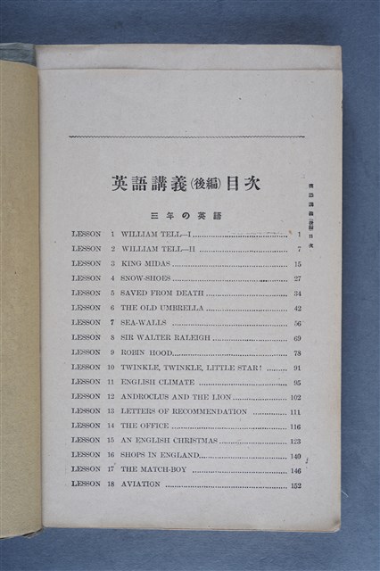 本件為早稻田大學出版部發行之《早稻田中學講義》,副標題為:「英語講義」(後編),由學習院教授山田巖講述,發行日期不詳,內容為中學三年級程度英語課文共18課、高級英語課文共16課。本文物為梁乃悅先生捐贈伯父梁梓義之日本時代個人物品。講義錄是戰前日本十分流行的通信教育(函授教育)教材,其中最有名的即早稻田大學發行的講義錄。早稻田大學的前身東京專門學校自1886年起開始發行通信講義錄,提供因家境等因素無法到都市升學中等學校的青年通信學習的機會,講義錄的學習者稱為「校外生」,可以到學校旁聽、利用圖書館,考試合格