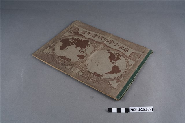 本件為日本文部省編定、大阪書籍株式會社翻刻發行之《尋常小學地理書附圖》,本圖初版日期為大正12年(1923)12月27日,翻刻發行日期為大正13年(1924)1月23日,共計22張彩色圖片,包括日本、海外殖民地、南洋群島、戰前中華民國、世界其他地區地圖。本文物為梁乃悅先生捐贈伯父梁梓義之日本時代個人物品,惟書底寫有:「(18) 五は趙氏水錦」字樣。