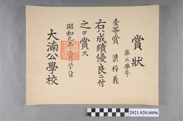 2021.020.0096 梁梓義大湳公學校第三學年成績優良賞狀