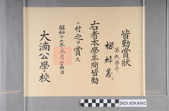 2021.020.0102 梁梓義大湳公學校第六學年全勤獎狀