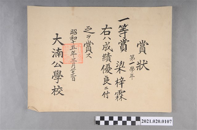 2021.020.0107 梁梓霖大湳公學校第一學年成績優良獎狀