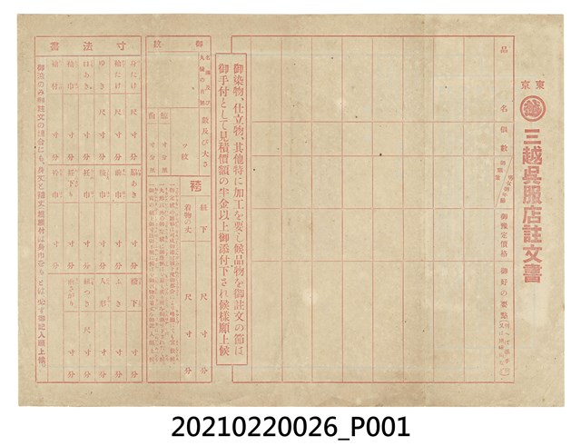 此文物為東京三越和服店的採購訂單,訂單上分為3個部分,第1部分為訂購物的基本資料描述,有以下格式:品名、個數、職業、行別、年齡、預定價格、喜好,第2部分為家紋的問題詢問,第3部分為尺寸詢問。