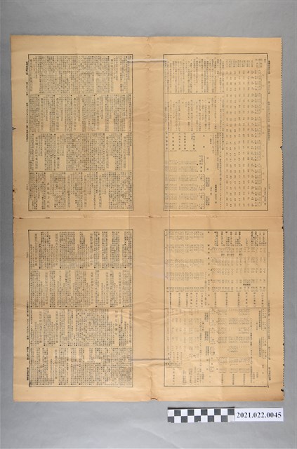 臺灣總督府是日治時期臺灣最高行政機構,所發布的《臺灣總督府府(官)報》等同於現今的政府公報,可以查閱當時發布的各項重要行政舉措,包含法律、天皇名義發布的敕令、各級相關機關行政命令、都市計畫,以及各項施政等。此報紙發行時間為昭和19年(西元1944年)6月28日第688號水曜日,發行單位為臺灣總督府,出版單位為臺灣新報社,此報紙顏色已呈深褐色,摺痕處有褐色斑點,字跡保存清晰完整。
