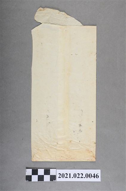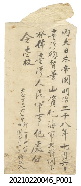 此為臺灣總督樺山資紀發佈臺灣人民軍事犯處分令信封,命令發布的時間為明治28年(西元1895年) 7月6日,信封上書寫的文字臺灣總督樺山資紀海軍大將閣下發佈臺灣人民軍事犯處分令壹枚,此信封的紙張泛黃有皺褶,信封上方破損,紙張分布少數褐色斑點,字跡保存清晰完整。應為林佐璇等人於大正丁巳年收入。