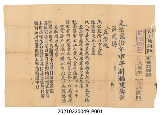 此為光緒20年(西元1894年)甲午科福建鄉試試題,此試題右側蓋有五枚四方關防,由右至左分別是大主考關防、內監試關防、監臨關防、提調關防、監試關防,此試題的紙張泛黃、有皺褶,字跡保存清晰完整。