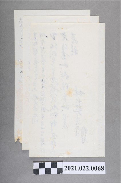 此為林少超寫給舅舅來旺先生的問候書信,寫於?月13日,年代不詳。文中表示,作者最近聽聞舅舅月中時準備近京留學,故希望對方在本月18日和自己會面敘舊。本物件有3封,內容大同小異,但紙張背景樣式不同,分別為:「一男子在涼亭觀海圖」、「樹與岩石的風景圖」、「一建築環繞草木圖」。