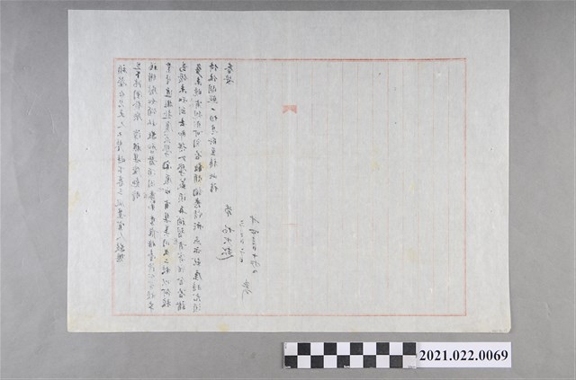 此為林少超寫給禎榮的書信,日期為國曆4月19日、農曆3月2日,未標註年代。文中描述,林少超的弟弟從臺灣公學校畢業,即將赴往廈門求學。他聽聞當地有「集美」和「同文」兩校,卻不知何者為優;對於入學方式、住宿的有無,等事項諸多不清楚,故詢問有無「規則」可供閱覽,並希望對方在未來能夠多加關照。