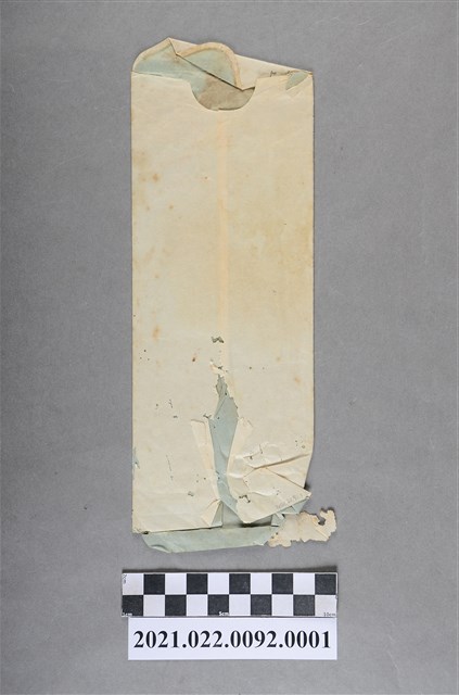 這是一個裝有家產資料及地字還有分房契約書的紙袋,紙袋邊緣已有些毀損及些許墨漬,袋子上有「契約書」三個字,字跡潦草。