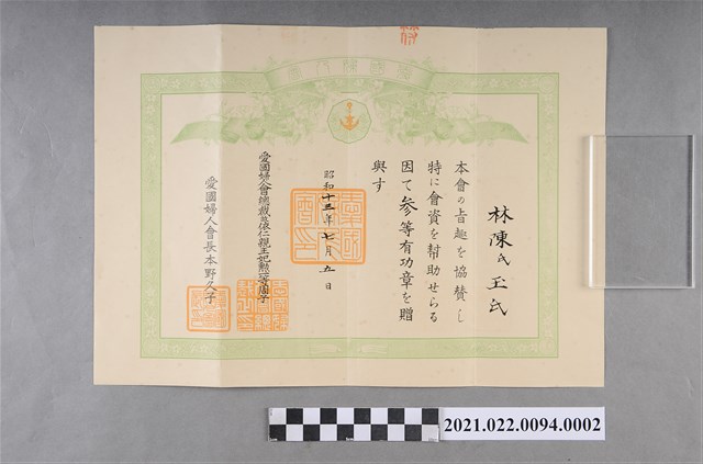 2021.022.0094.0002 愛國婦人會頒予林陳玉參等有功章感謝狀