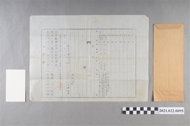 此為林少超同意臺灣總督府專賣局使用內記土地上的天然樟木製成製樟腦用原料之承諾書與臺灣總督府專賣局臺中支局直轄腦長陳明陽之直式名片及裝有契約書之信封。