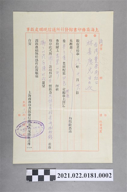 2021.022.0181.0002 民國18年上海商務印書館發行所通信現購處寄林喜慶啟事
