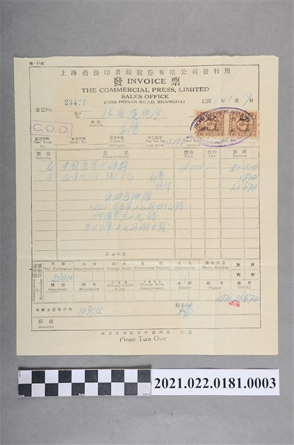2021.022.0181.0003 上海商務印書館發行所寄林喜慶之發票