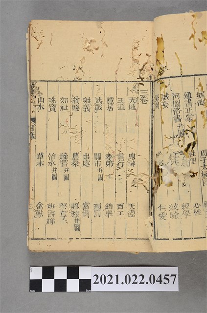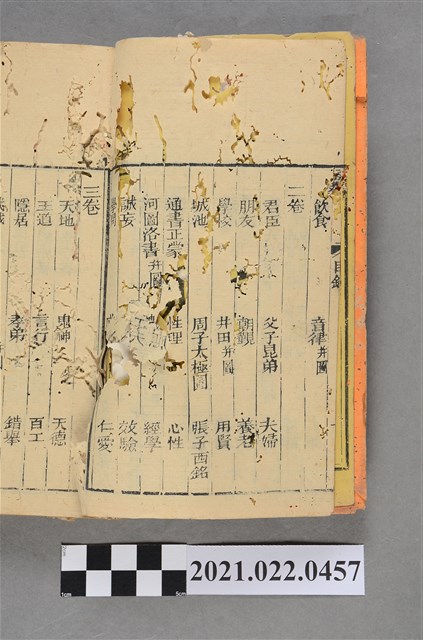 本物件為四明孫上登編輯《行文語類》,為橘色書皮線裝書,封面有「行文語類」、「卷壱、弍」字樣,扉頁為黃底,印有「同治7年新鐫」、「四明孫上登編輯發兌」、「重訂行文語類」、「廈門文德堂書房發兌」等字樣。內頁蟲蛀嚴重,本書內容包含孔子、十哲、思孟、禹湯、朋友、心性、天地等主題。