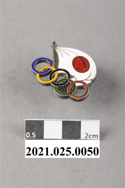1.本物件為張星賢所藏日本奧運紀念章,上方為日本國旗、下方為奧運五環標誌。