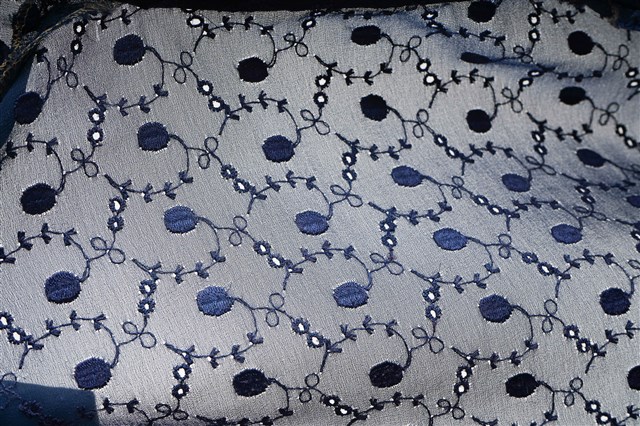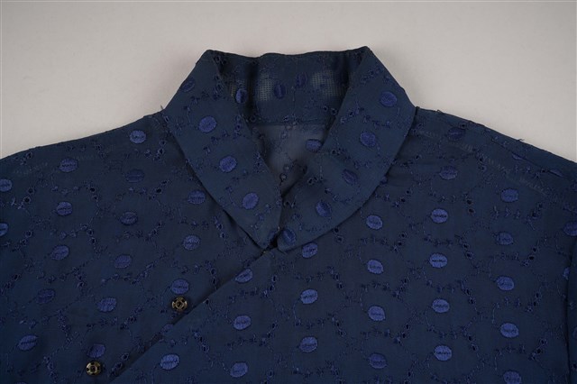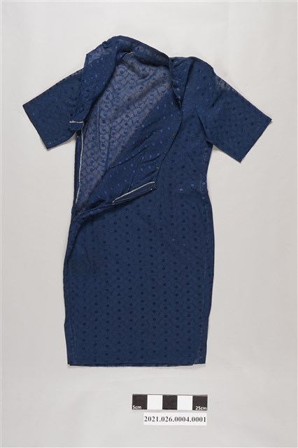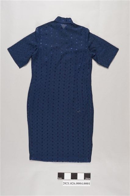 本件為寶藍色蕾絲繡花五分袖夏旗袍,全件以質料輕薄之寶藍色蕾絲繡花紗布製成,蕾絲繡花圖案為圓葉片與小花。具小立領,自領口開右衽斜下至脇邊,以金屬釘釦開合固定,五分袖,軀幹寬鬆,腰身不明顯,裙長約至穿著者之膝下至小腿上,下擺略內收,質料十分薄透,為夏季服飾。