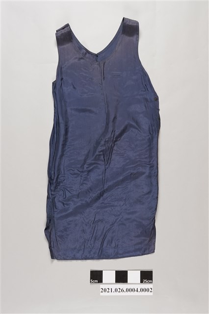 本件為旗袍內襯衣,為寶藍色絲質一件式長背心裙,開大V領,軀幹寬鬆,機縫與手縫痕跡明顯,裙襬一側還有一小塊黑棉布補丁。