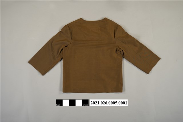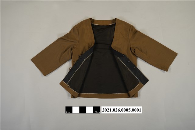 2. 本件為橄欖綠棉V領對襟長袖短外套,長度約及上腹部,開襟附有三個圓型布釦。本件可單獨穿著或外加於旗袍之外,天冷時可保暖,並顯正式。