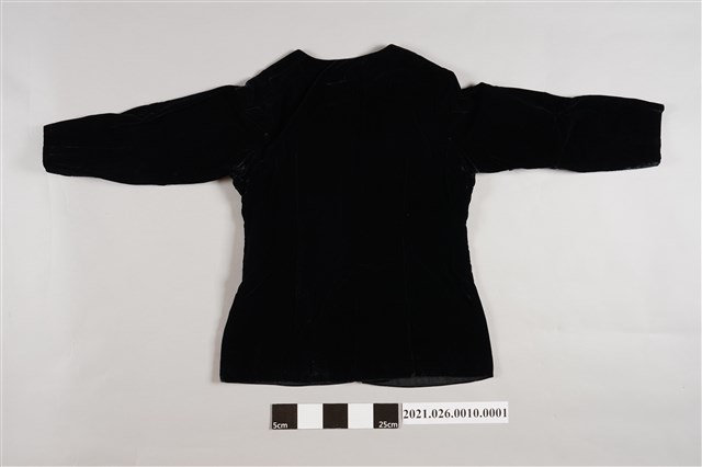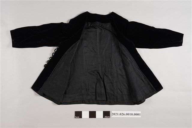 2. 外套以黑絨布裁製成西裝外套形式,開深V領無領子,對襟處以圓型布釦與布環作開合固定,內裡以黑色棉布為鎮。袖長窄口,軀幹寬直無腰身,整體十分樸素。從顏色與質料上推測為冬季外套,除與0002號長褲一整套穿外,外套亦可單獨搭配旗袍穿著保暖。