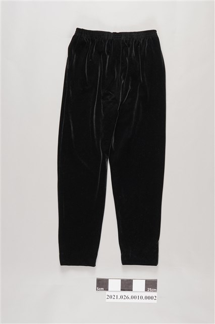 2. 窄口長褲以黑絨布裁製而成,內裡同上衣以黑棉布為襯裡,腰部採鬆緊帶式,左右各有一個口袋,褲管上寬下窄。從顏色與質料上推測為冬季長褲,除與0001外套一整套穿外,亦可單獨搭配其他上衣或外套穿著。