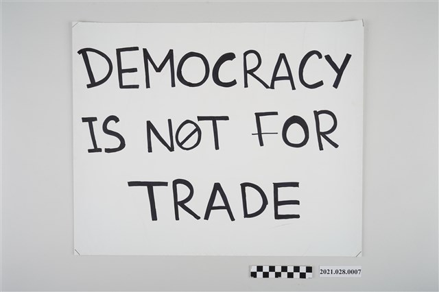 2021.028.0007 手寫「DEMOCRACY IS NOT FOR TRADE」的文宣